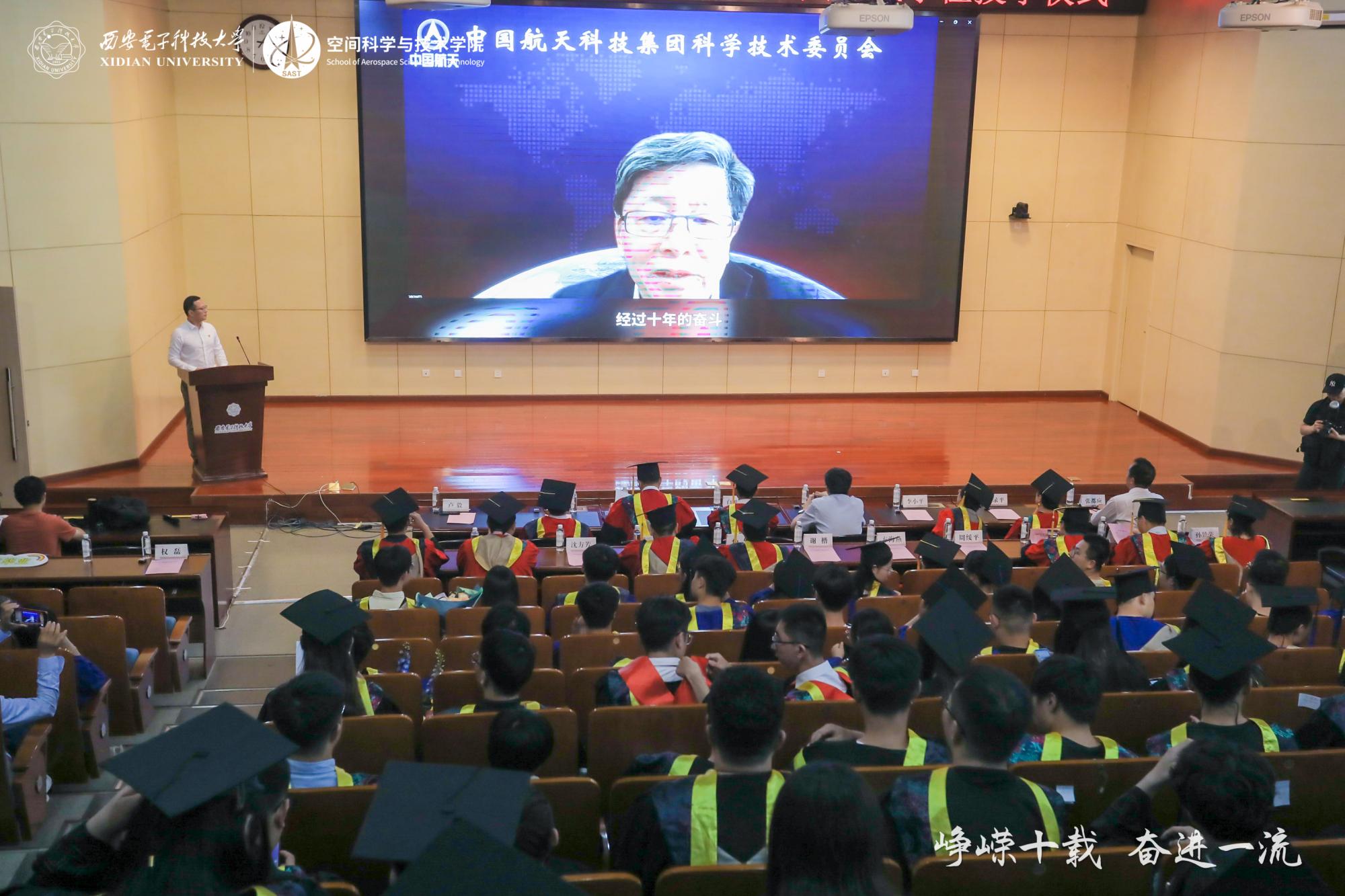 在庄严肃穆的国歌声中,毕业典礼拉开帷幕。包为民院士寄语公司2023届毕业生,他表示,经过十年的奋斗、创造、积累,空间公司师生淬炼和涵育了“胸怀祖国、勇于探索、知行合一、团结协作”的航天报国情怀,这是公司十载创业兴学的思想之魂,也是新时代公司师生砥砺奋进的动力源泉。希望公司2023届毕业生能够把航天报国和科技报国作为一以贯之的价值追求,心怀大爱,目有山河,以梦为马,不负韶华。一是要胸怀祖国,志存高远。秉承爱党爱国的西电传统,传承红色基因,心怀国之大者,想国家之所想,应国家之所需,将个人发展之目标融于国家发展之大势。二是要勇于探索,砥砺前行。不断汲取“十年磨一剑”的坚韧精神,锤炼“百折不挠”的意志力,在工作学习中厚积薄发,积跬步以至千里。三是要知行合一,求真务实。秉持勤勉务实的西电特质,在实践中不断提升自己,完善自己,增强解决实际问题的能力。四是要团结协作,开放包容。要学会在与人的交流中进步,在团结合作中成长,与志同道合的伙伴一起在集体中更好地成长成才。