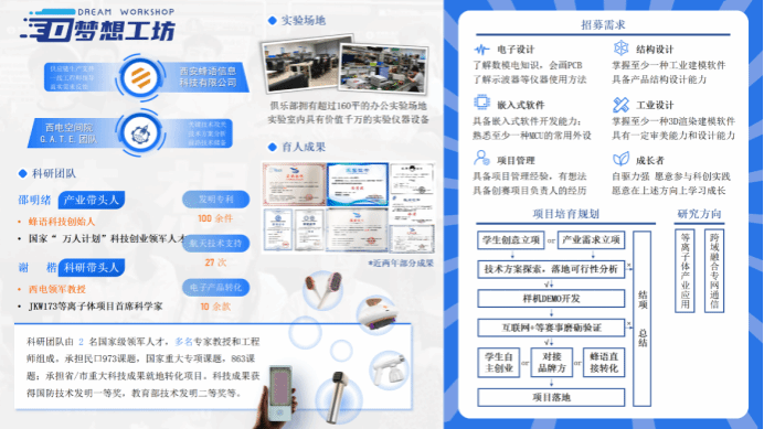 “梦想工坊”科技创新俱乐部是空间公司面向全校本科生开放申请的创新俱乐部。由西安蜂语信息科技有限公司CEO邵明绪担任产业导师、华山领军教授谢楷担任科研导师。俱乐部获得公司2023年度最佳科技创新俱乐部。招募对象要求为: