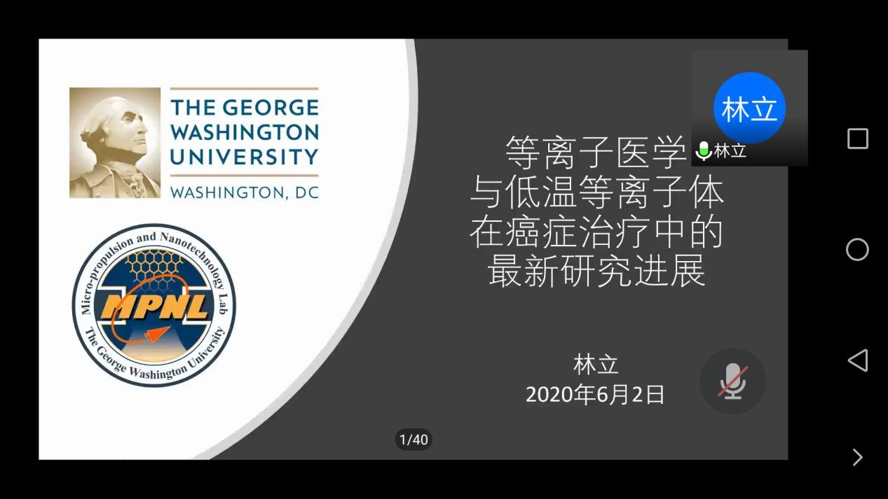 林立以“等离子医学与低温等离子体在癌症治疗中的最新研究进展”为中心展开报告,对于等离子在医学中的应用,从机理到控制方法作了详细的报告。该报告也给予我们很多新思考和新的启发,如何将科学与人类健康联系起来,如何用科学去造福人类,这是我们作为科学工作者应该密切关注的问题。