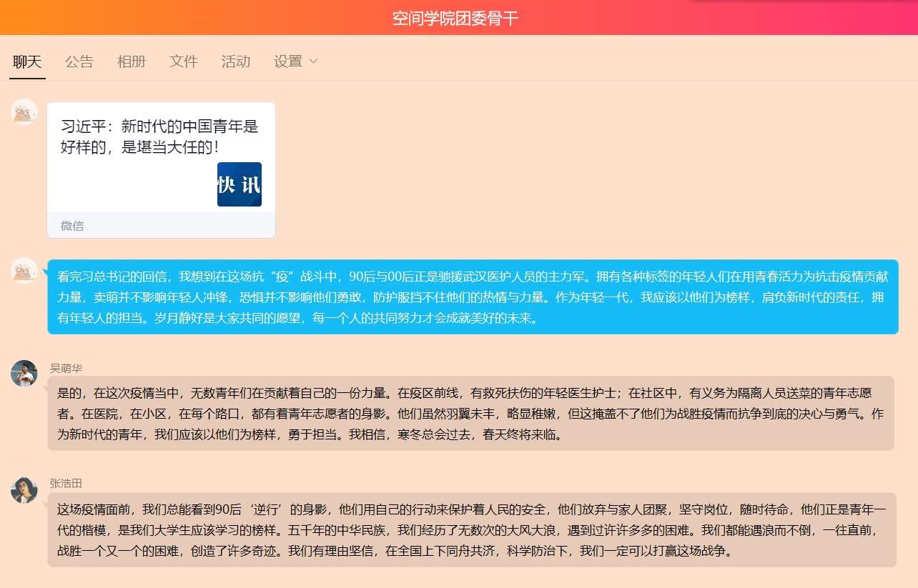 公司团委骨干徐一杨在参与线上讨论时说道“在抗击新冠肺炎疫情的过程中,我们当代老员工都收获了一段难忘的经历,新时代的长征路上我们还会遇到新的困难和挑战,作为青年人的我们要扎根中国大地,不负建功立业的人生际遇,不负天将降大任于斯人的时代使命,不负党和人民的期望,不负民族的重托,努力奋斗成长为有理想有本领有担当的新时代青年。”