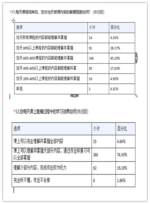 调研数据表明,绝大多数员工对公司线上教学整体满意,对老师授课方式普遍认可。网络授课改变了传统线下学习的方式和节奏,员工们可以更加高效自主的分配时间,从“面对面”到“键对键”的改变,大部分员工的积极性、主动性有所提升,员工获得感明显增强。其中,66.25%的员工每天平均花费1-2小时用于线下预习、看资料,员工在课堂上对知识的掌握程度基本在60%-80%,74.3%的员工认为通过课后作业和复习可以全部掌握,但也存在20%左右的员工尚未完全适应网络教学新生态,对线上教学过程接受程度较低。