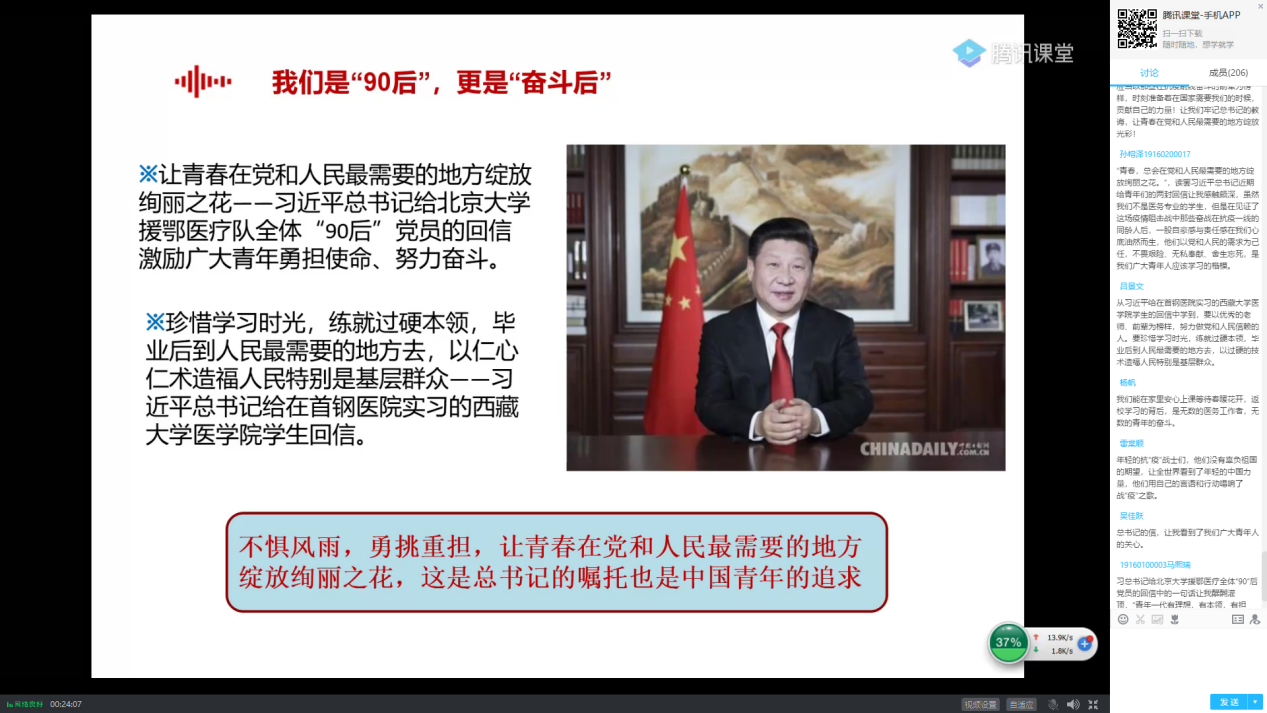 “新时代中国青年在此次疫情防控阻击战中勇于担当、甘于奉献,展现了青年人该有的朝气蓬勃和青春力量,习近平总书记的两封回信,不仅是对我们当代青年的充分肯定,更是对我们的殷切期望,希望同学们能够充分领会总书记的回信精神并转化到日常行动中,只争朝夕,不负韶华,珍惜本科四年的大好时光,锻炼意志品质,加强理论学习,提高实践能力,让青春在奋斗中绽放光彩”,辅导员郑瑞博利用腾讯课堂平台面向公司2017级、2019级全体员工开展了专题点名,带领员工深入学习习近平总书记近期两封回信精神,并组织员工开展线上大讨论,借助课堂发言功能与员工讨论交流学习感悟,进一步加深员工对于回信精神的思考和理解。