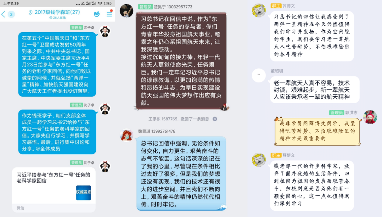 学习结束后,钱班学子纷纷表示通过学习近平总书记回信精神,更加深切体会到了党和国家对于航天事业的高度重视,感受到了习近平总书记对广大航天人“弘扬‘两弹一星’精神的殷切期望。广大空间学子定会牢记并传承老一辈航天人的拼搏精神和家国情怀,不忘初心、牢记使命,为把我国建设成为航天强国而不懈奋斗!