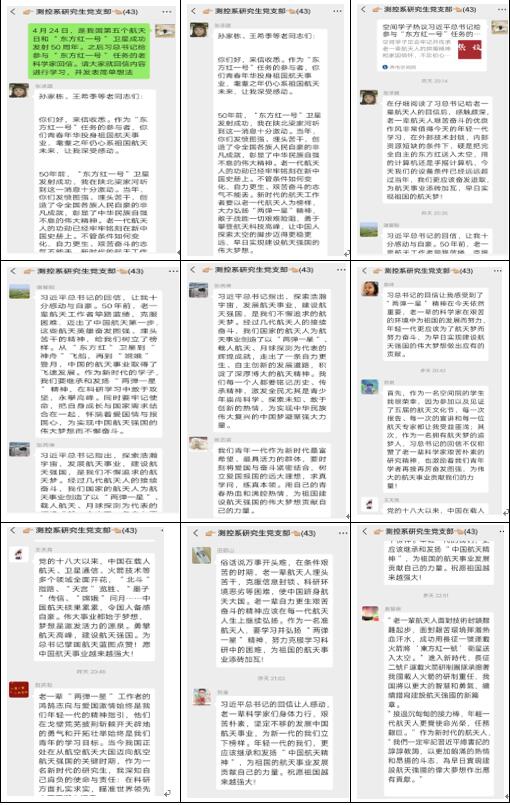为了学习感受航天精神和老一辈科学家的家国情怀,空间公司测控通信研究生党支部于4月28日晚组织支部党员就回信内容和“两弹一星”精神进行线上学习,大家学习后都积极踊跃的发表了自己的想法,分享了航天精神对新时代的学子、对自己的影响与鼓励。