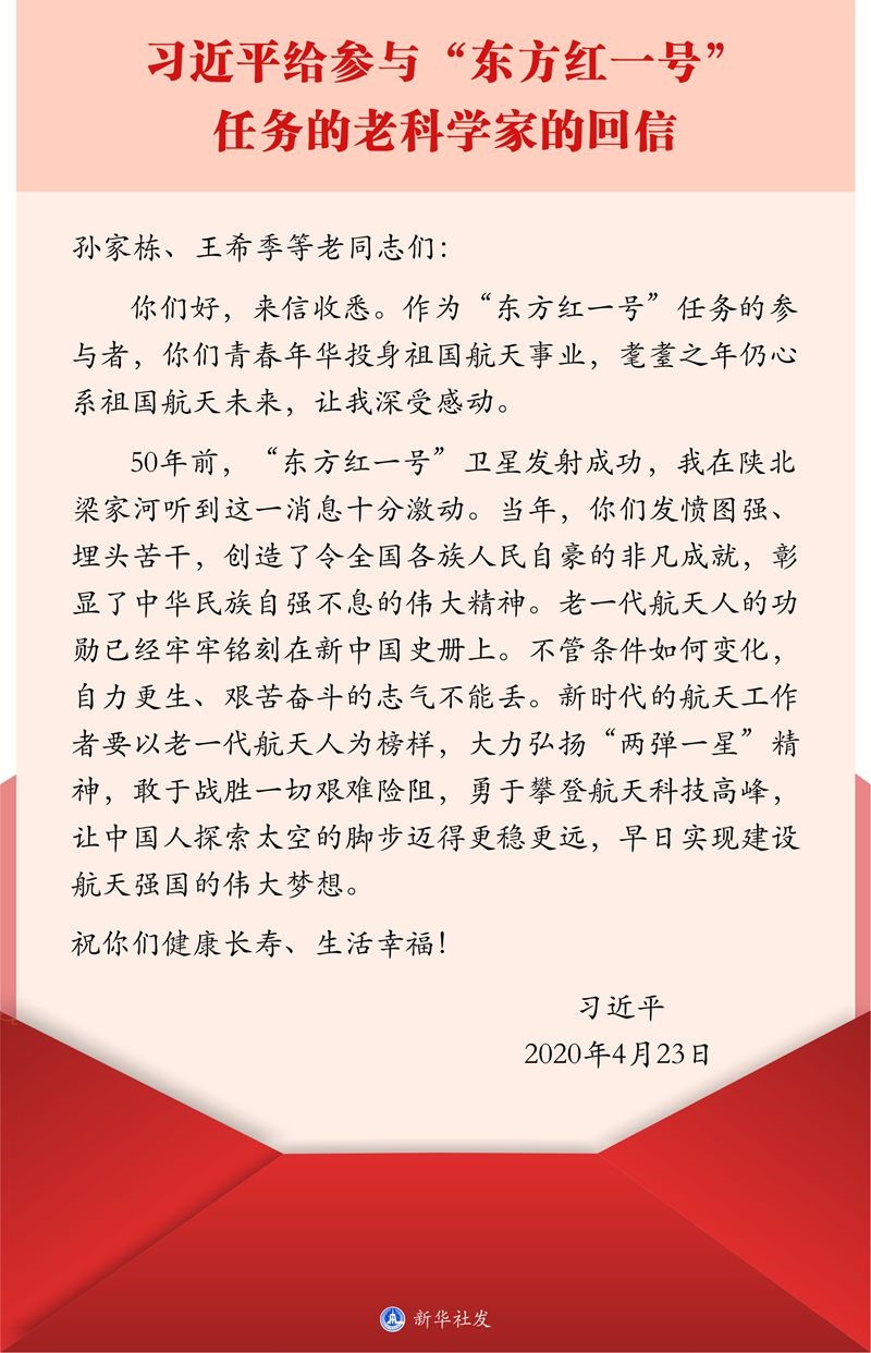 (通讯员:赵敏)4月24日,是我国第五个航天日和“东方红一号”卫星成功发射50周年。在这一天到来之际,4月23日习近平总书记给参与“东方红一号”任务的老科学家回信,向他们致以诚挚的问候,并就弘扬“两弹一星”精神、加快航天强国建设向广大航天工作者提出殷切期望。回信指出:“要以老一代航天人为榜样,大力弘扬‘两弹一星’精神,敢于战胜一切艰难险阻,勇于攀登航天科技高峰,让中国人探索太空的脚步迈得更稳更远,早日实现建设航天强国的伟大梦想。”