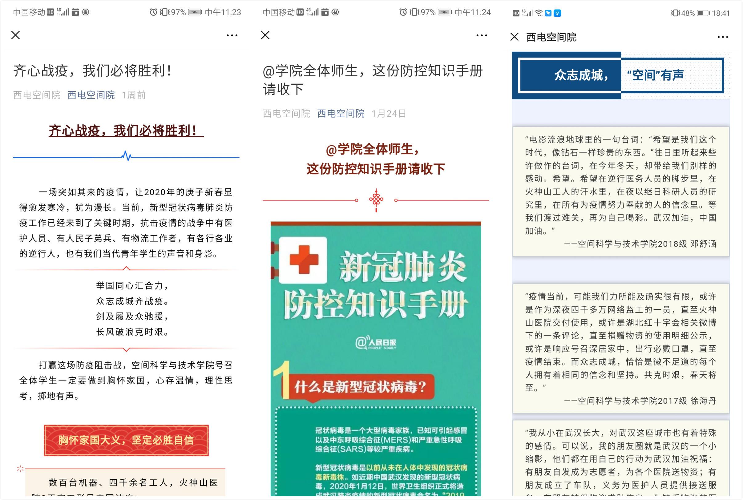 新冠肺炎疫情出现以来,空间公司的员工们纷纷行动,通过各种形式参与到疫情防控工作当中,用实际行动展现着西电青年、空间学子的家国情怀和使命担当。