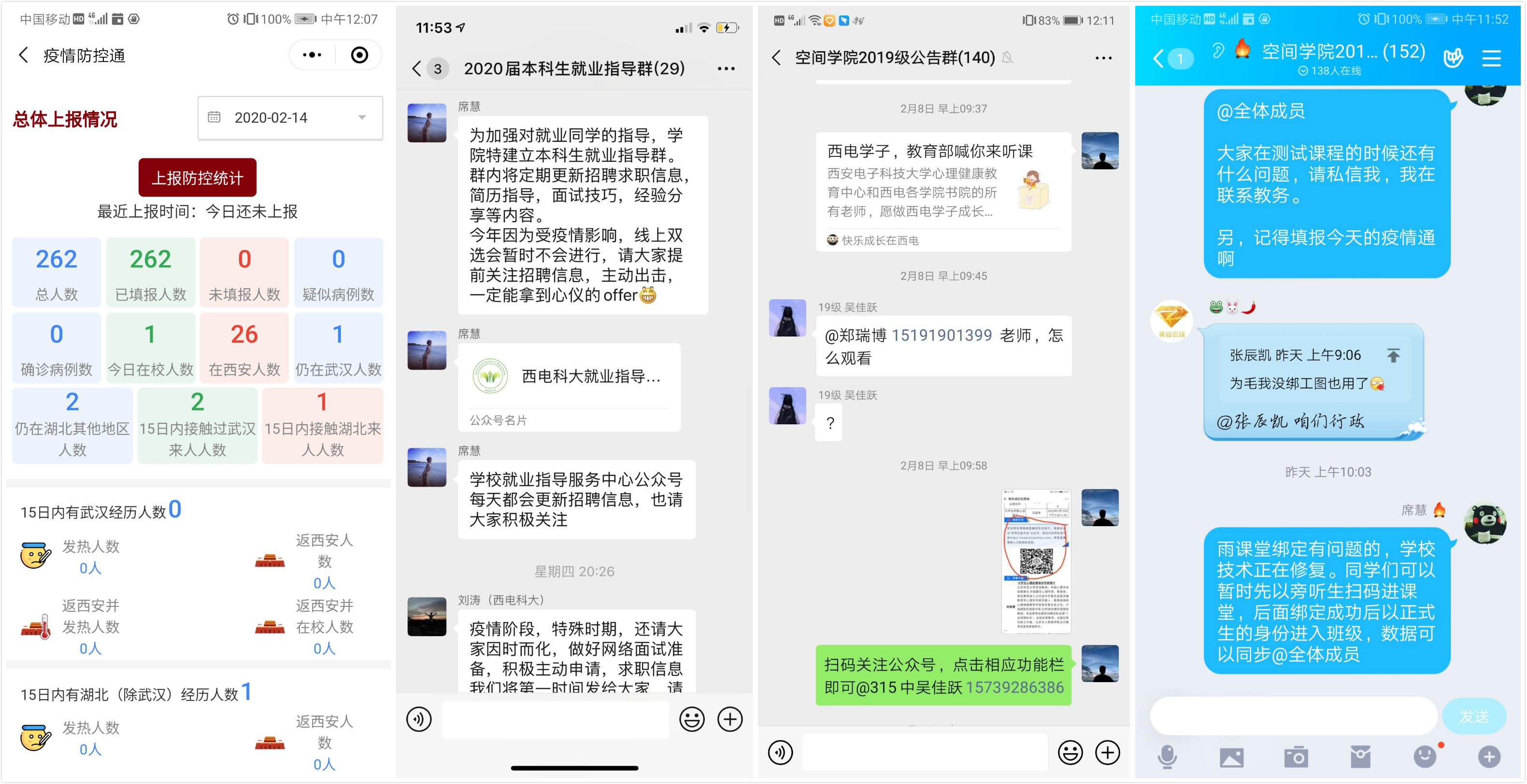 每天上午8时起,公司各年级、班级的员工群中就会反复弹出提醒按时填报今日疫情通的消息,在辅导员和员工班干部“人对人”的逐一督促下,完成员工个人健康数据100%反馈和湖北籍员工每日联系100%覆盖。空间公司每日的员工疫情防控工作也从这一刻开始。