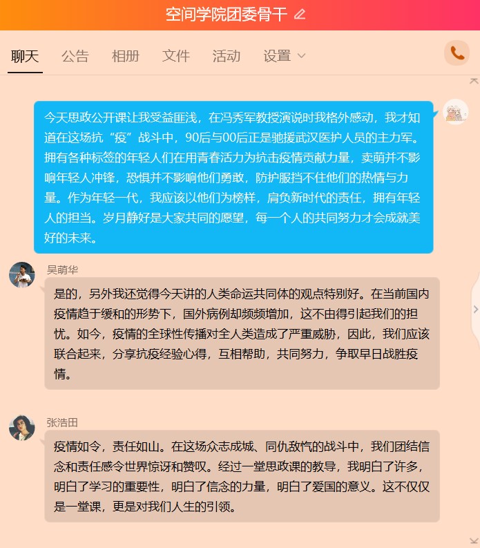 空间公司团委骨干张博康说:“今天思政公开课让我受益匪浅,在冯秀军教授演说时我格外感动,我才知道在这场抗“疫”战斗中,90后与00后正是驰援武汉医护人员的主力军。拥有各种标签的年轻人们在用青春活力为抗击疫情贡献力量,卖萌并不影响年轻人冲锋,恐惧并不影响他们勇敢,防护服挡不住他们的热情与力量。作为年轻一代,我应该以他们为榜样,肩负新时代的责任,拥有年轻人的担当。岁月静好是大家共同的愿望,每一个人的共同努力才会成就美好的未来。”