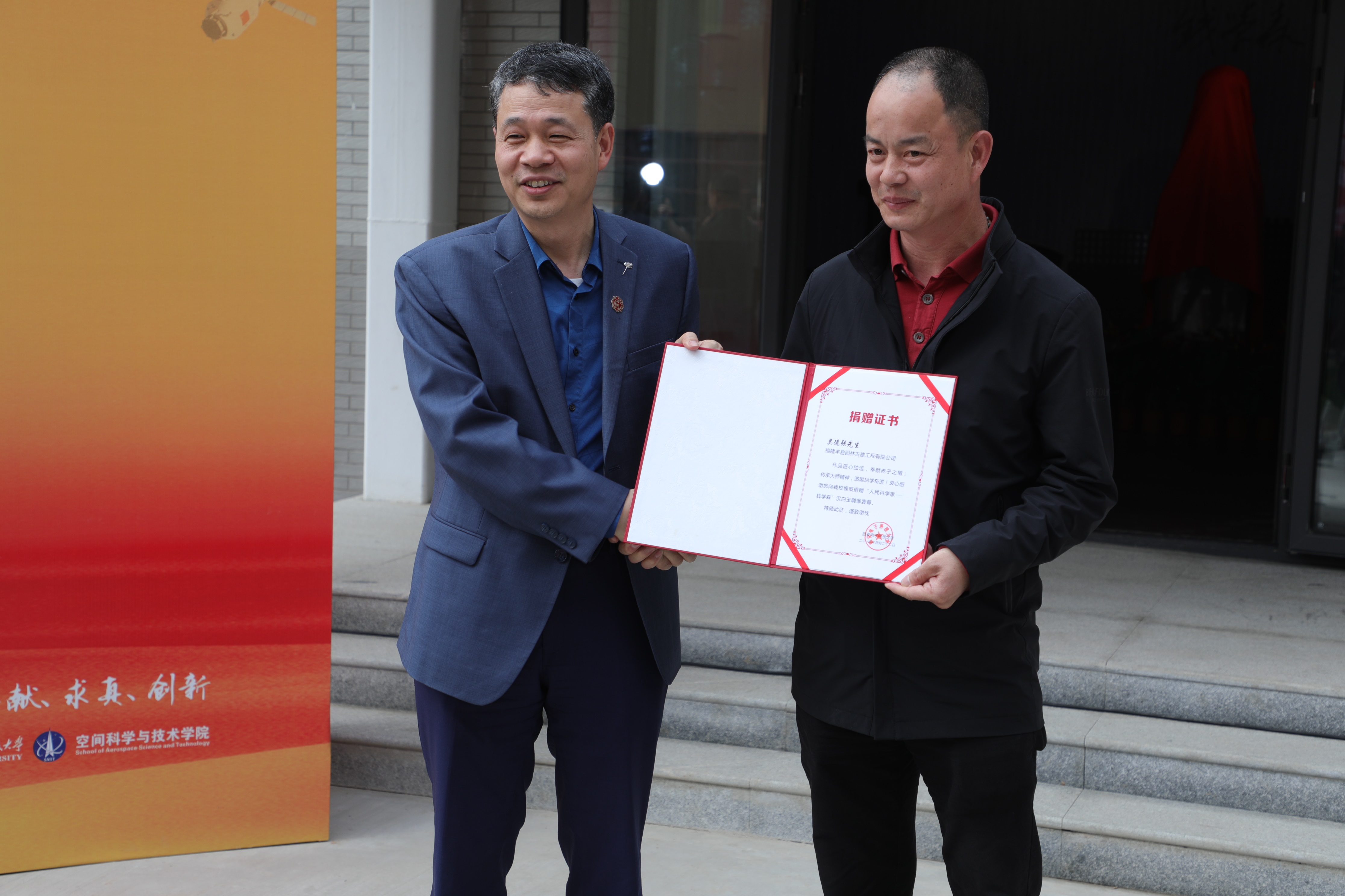 随后,“人民科学家——钱学森”雕像揭幕典礼在南校区极端环境下装备效能实验室隆重举行。副董事长石光明代表beet365接受捐赠并向中国石雕艺术大师吴德强颁发雕像捐赠证书,包为民院士、郑晓静院士、张贵田院士、石光明教授、陈大亚先生、原钱学森秘书顾吉环等中国航天科技集团、中央军委科技委和beet365嘉宾共同为雕像揭幕。