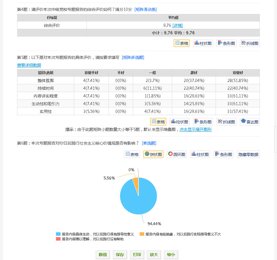 本次业余党校中级班继续采用微信二维码签到方式,很多同学在报告中和报告后也通过“空间党群e家”的“红色足迹”分享了参与报告的心得体会,大家纷纷表示吴老师的讲座生动深刻,发人深思。为更好地了解讲座效果,拓宽高效反馈渠道,本次专题报告采用了问卷星调研方式,及时了解员工们对于专题报告的意见反馈。超过94%的同学都认为本次报告内容具体生动,对于今后践行社会主义核心价值观具有较强的指导性意义,同时希望以后可以多组织相关实践活动,开展志愿服务,把践行社会主义核心价值观落到实处。