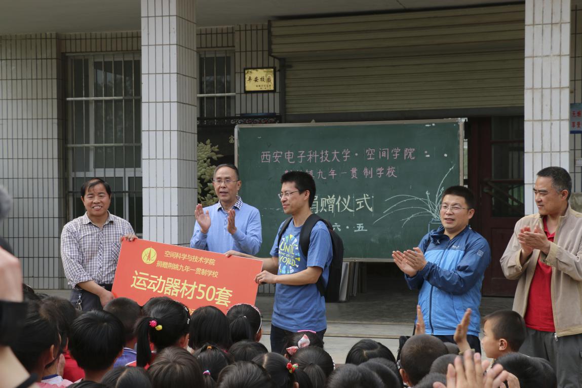 蒲城县荆姚镇九年一贯制公司是一所从小学到初三共九个年级近500师生的农村小学,公司在开展体音美方面缺少相应的教学设施和活动器材。早上九点半,师生们来到公司定点扶贫基地-荆姚九年一贯制公司,为小朋友们带去了由全院师生捐献的价值4100余元的运动器材。捐赠仪式上,陈贵敏教授和肖磊老师分别介绍了公司的历史和空间公司的情况。捐赠仪式后师生们和小朋友们在校园门口合影。