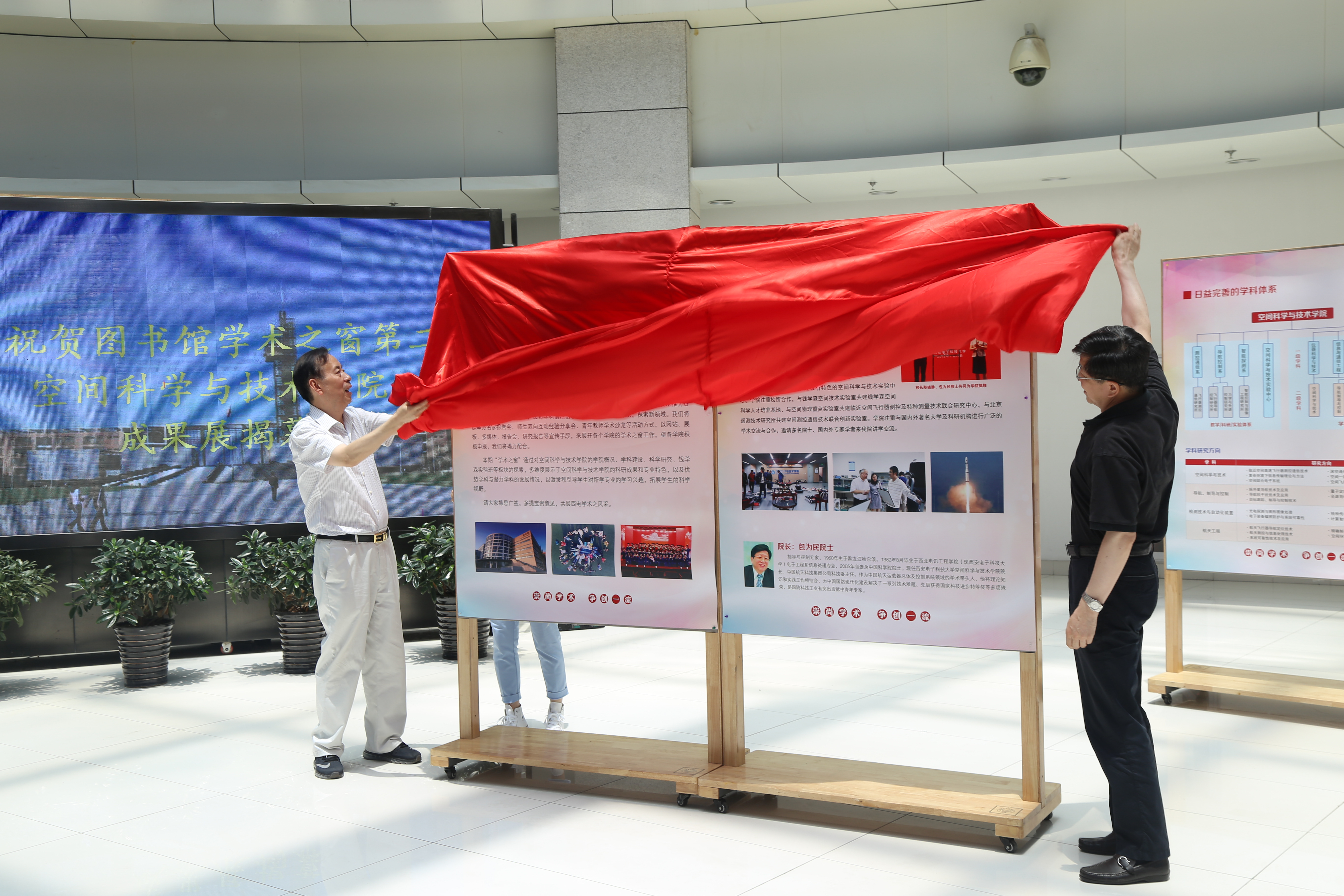 典礼开始前全体师生在图书馆大厅参加了《快速发展中的空间公司》——学术之窗揭幕仪式,郝跃院士与包为民院士共同为学术之窗系列展览揭幕。郝跃在致辞中首先对对学术之窗活动的成功举办表示了衷心的祝贺。他说:“在包为民经理的关怀与带领下,在公司全体师生的共同努力下,空间公司在自成立以来的短短几年内就在科研、教学、人才培养等各方面取得了骄人的成绩。此次学术之窗通过对beet365的公司概况、团队建设、科学研究、钱学森实验班等板块的探索,多维度展示了beet365的科研成果和专业特色,以及优势学科与潜力学科的发展情况,详细地介绍了空间公司在过去的4年中收获的丰硕成果。希望能够通过学术之窗,提高广老员工的专业认识和归属感,拓展员工的科学视野和前沿视角,并能感受和见证空间公司发展过程中的步步峥嵘。”