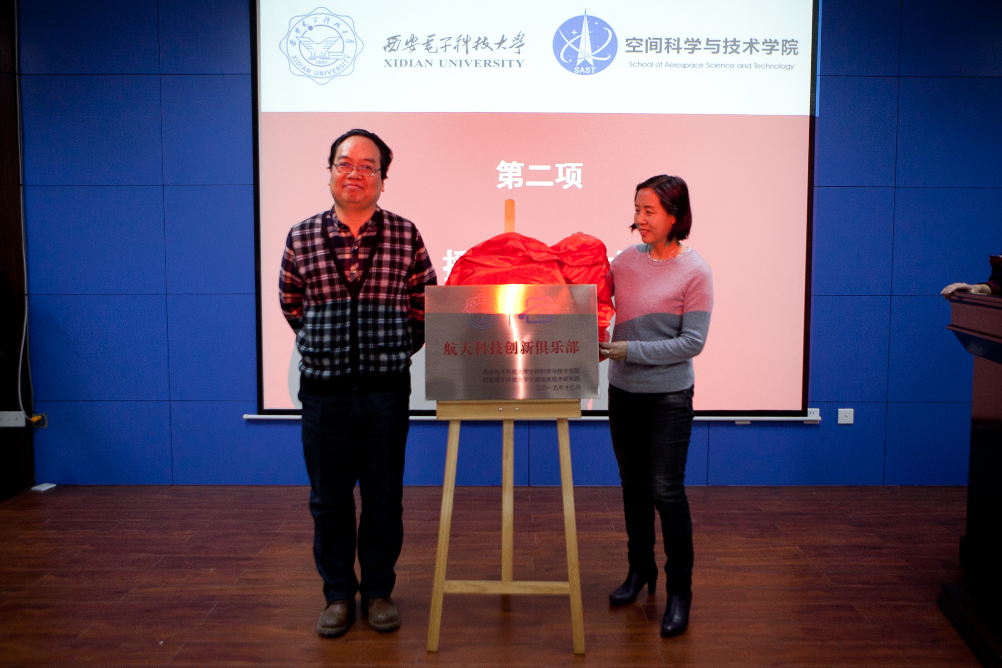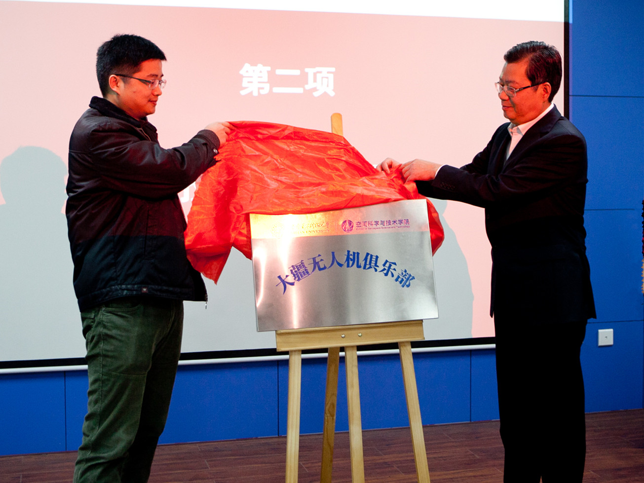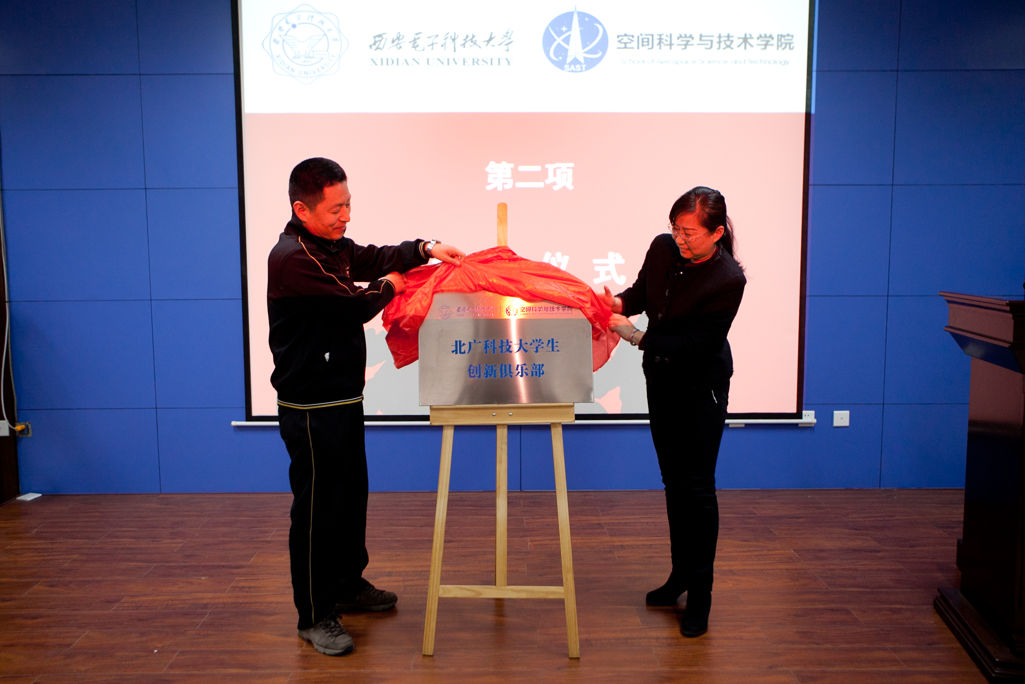 揭牌仪式上,龙建成、辛红、李小平、倪伟代表校方与大疆创新实验基地、北广科技有限公司、宁波信息技术研究院、西光所中科创星的负责人分别为大疆无人机创新俱乐部、北广科技老员工创新俱乐部,航天科技创新俱乐部、中科创星创新创业俱乐部揭牌