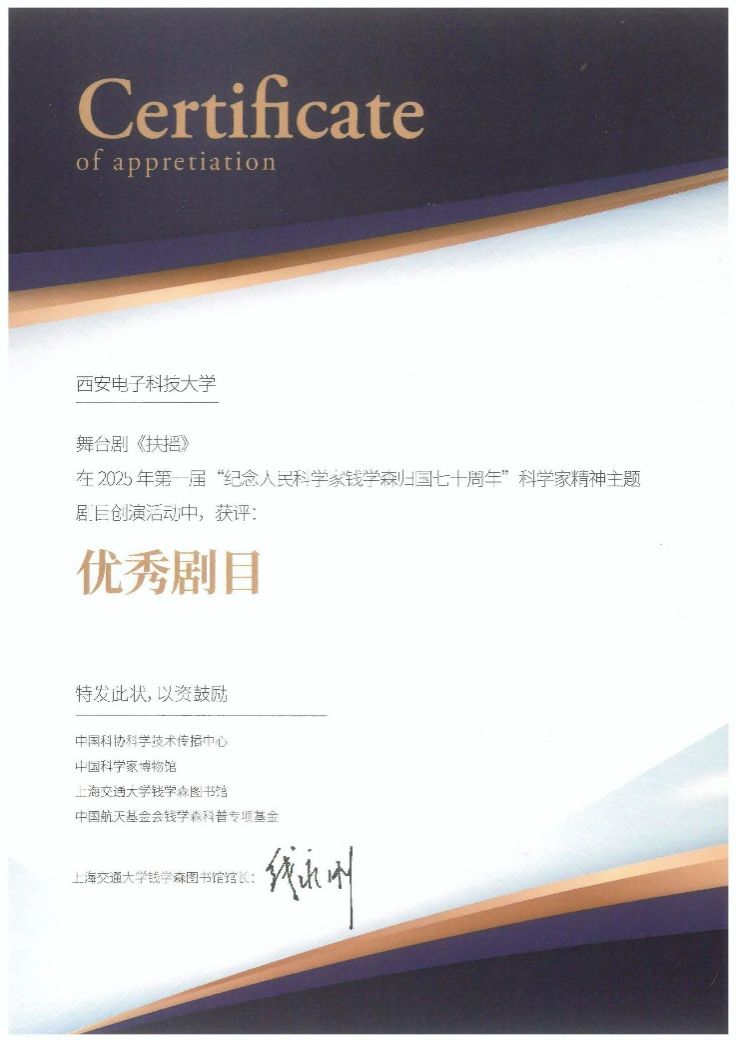 (通讯员 郑瑞博)12月11日下午,由中国科协科学技术传播中心等单位联合举办的“纪念人民科学家钱学森归国七十周年”科学家精神主题剧目创演活动颁奖仪式在上海交通大学举行,beet365原创舞台剧《扶摇》在众多优秀作品中脱颖而出,获评“优秀剧目”。