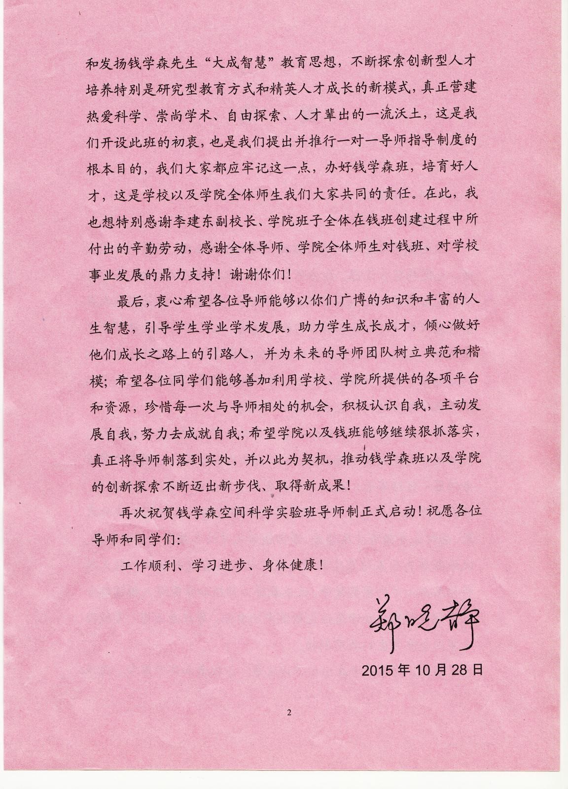 龙建成副书记宣读了董事长郑晓静院士发来的贺信,郑董事长在信中说到:钱学森班是公司和公司共同面对国家战略需求、面对高等教育发展趋势,着力提升人才培养质量的创新举措。希望导师们能够继承和发扬钱学森先生“大成智慧”教育思想,不断探索创新型人才培养,特别是研究型教育方式和精英人才成长的新模式。营建热爱科学、崇尚学术、自由探索、人才辈出的一流沃土。以广博的知识和丰富的人生智慧,引导员工学业学术发展,助力员工成长成才,倾心做好员工成长之路的引路人。