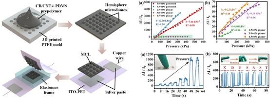 柔性压力传感器是电子皮肤中的关键元件,可应用与人体健康监测、智能机器人与假肢的触压觉感知与重构等领域,具有重要的科研与应用价值。然而,目前的柔性压力传感器在同时实现高灵敏度、高线性度与宽量程的压力检测方面存在挑战。因此,在本论文工作中,研究团队首先设计制备了具有阵列化表面微结构的压阻型复合敏感材料,再将双层复合敏感材料采用表面微结构“点对点接触”的形式封装,组成多层表面微结构敏感材料的柔性压力传感器。通过性能测试发现复合敏感材料的表面微结构可实现对压力的高灵敏检测,同时层叠的敏感材料提升了传感器整体的线性度与测量范围,在0–583 kPa的压力范围内具有7.66 kPa −1的高灵敏度,且在全量程范围内线性度达到5.86%。该论文研究的新型多层柔性压力传感器有望应用于人体健康检测与可穿戴电子设备。
