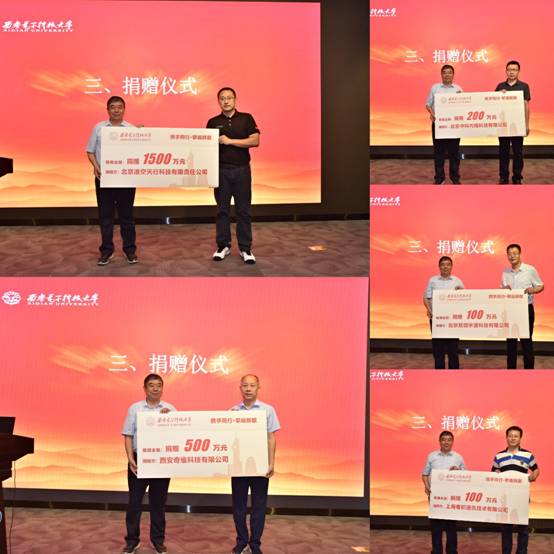捐赠仪式上,杨银堂代表公司接受捐赠并为企业负责人颁发证书。北京凌空天行科技有限责任公司董事长王毓栋向公司捐赠1500万元,西安奇维科技有限公司董事长刘升向公司捐赠500万元,北京中科内镜科技有限公司总经理张金刚向公司捐赠200万元,北京紫微宇通科技有限公司西安分公司总经理药亮向公司捐赠100万元,上海卷积通讯技术有限公司董事长薛玉磊派代表向公司捐赠100万元。捐赠总额共计2400万元。