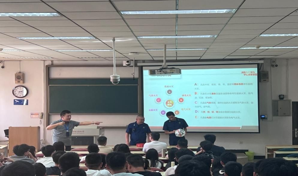 活动中,肖磊以同学们身边发生的真实火灾案例为切入点,深刻剖析了消防安全的重要性。他通过生动具体地讲解,不仅让新生对消防安全法规有了更为直观的认识,还深入浅出地传授了火灾预防的核心理念与实用技巧。肖磊强调“预防为主,防消结合”的消防方针,并和两位消防员亲自演示了防毒面具与灭火器的正确使用方法,确保每位新生都能掌握关键的自救技能,为构建平安校园贡献力量。