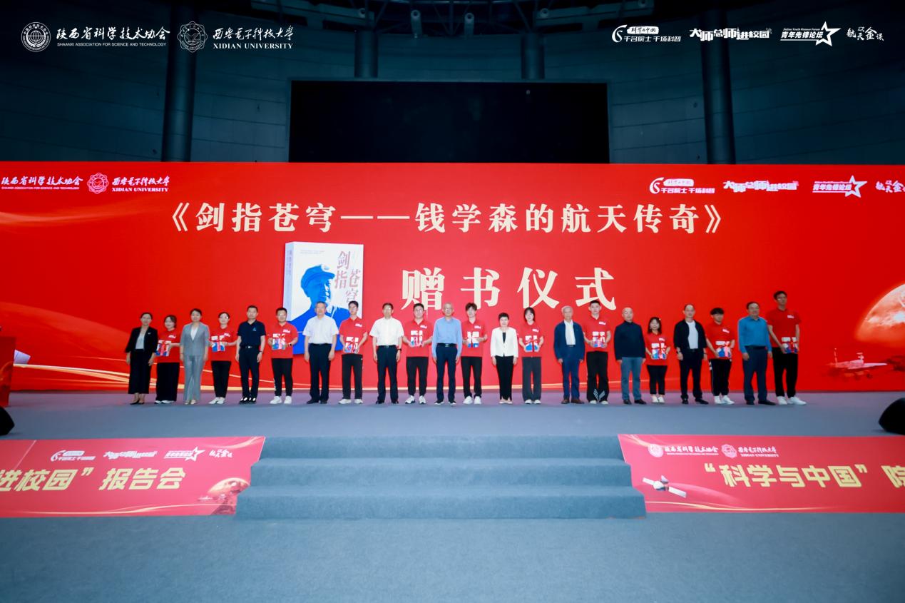 刚刚过去的第九个中国航天日,让我们不禁怀念钱学森这位伟大的人民科学家。“钱学森与中国航天”课题研究组采访了一百多位钱学森身边的科技工作者,抄录有关档案百万余字,精心编辑完成了《剑指苍穹—钱学森的航天传奇》这部钱老传记,并于今年3月出版发行。张荣桥、陈大亚、顾吉环、李明等专家和与会嘉宾共同为西电青年学子和航天行业员工会青年航天员工代表赠送了这部著作。