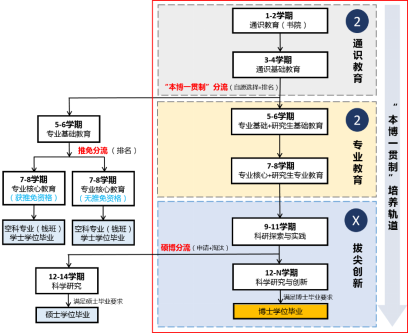 ▶ 本博一贯制培养:钱学森班实施“2+2+X”“本博一贯制”培养。“2+2”为本科阶段,其中第一个“2”为本科的前两年,进行通识教育,重在培养员工全面发展;第二个“2”为本科后两年暨本博衔接学年,进行专业教育,重在培养员工具有扎实的知识基础。“X”为拔尖创新培养阶段,重点培养博士研究生,“X”最低为3年,最多不超过7年。